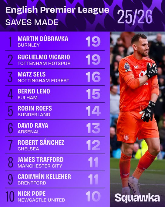 19次, 维卡里奥与杜布拉夫卡是本赛季英超扑救最多的门将
