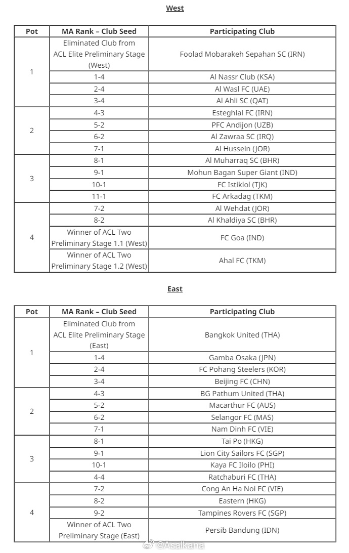 东西亚区仍将分开抽签,每个小组将会分别有一支来自本区域1号、2号、3号、4号种子的球队,北京国安和曼谷联、大阪钢巴、浦项铁人同为1号种子球队,因此他们将不会分在同一小组。同时,抽签时还将遵循同协会回避的原则,即来自同一协会的球队将不会分在同一小组。