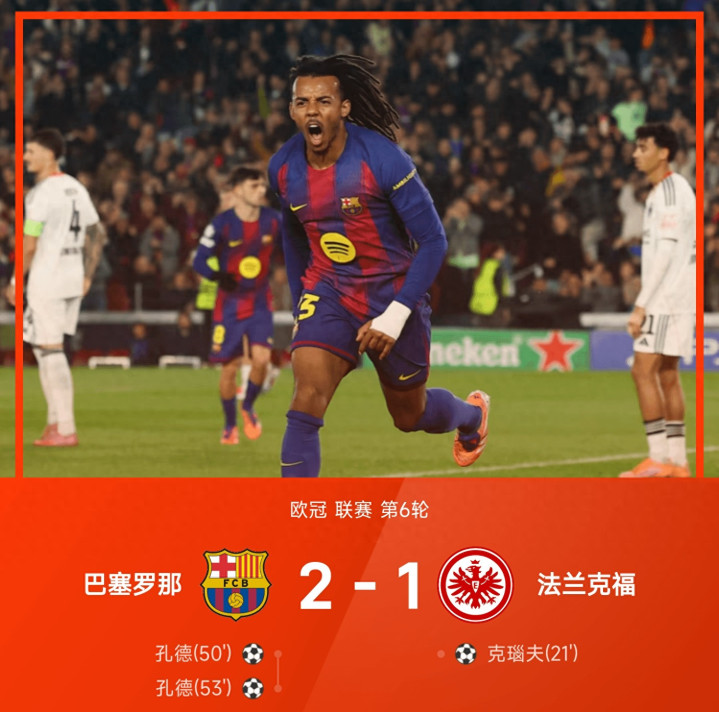 12月10日25-26赛季欧冠联赛阶段第6轮,巴塞罗那坐镇诺坎普球场迎战法兰克福。此役上半场,克瑙夫接应布朗直塞突入禁区推射命中助法兰克福打破僵局。易边再战,孔德先是接应拉什福德传中冲顶破门随即接应亚马尔传中争顶建功,助巴塞罗那反超比分。全场比赛结束,巴塞罗那2-1逆转法兰克福。