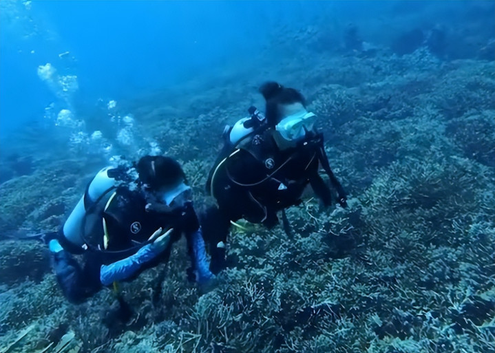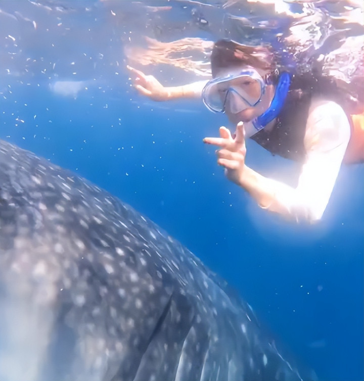 她比弟弟更加厉害,直接穿上潜水服,来到了水里跟水下的小动物合影。