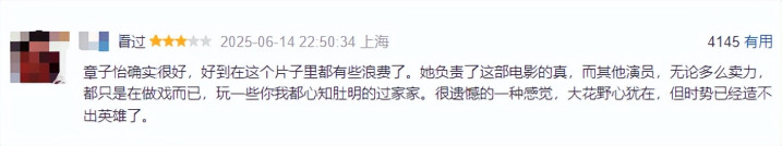 对于章子怡的表演,大伙儿一致认定“章子怡好到放在这个片子里,已经有些浪费了。”