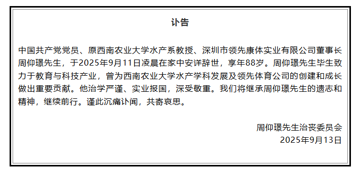 9月15日,深圳领先体育微信公众号发布讣告:深圳市领先康体实业有限公司董事长周仰璟先生,于2025年9月11日凌晨在家中安详辞世,享年88岁。讣告