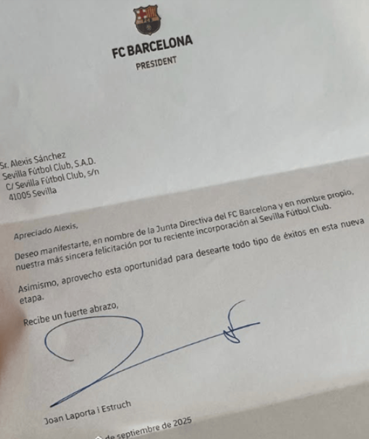 在这封由巴塞罗那俱乐部主席拉波尔塔签名的信中,加泰罗尼亚俱乐部祝贺了桑切斯在夏季转会窗的最后一天去到塞维利亚。信中写道:"我谨代表巴塞罗那足球俱乐部董事会及我本人,对你近期加盟塞维利亚表示最诚挚的祝贺。同时,我借此机会祝愿你在这一新阶段取得全面成功。"这封由拉波尔塔签名的信已送达桑切斯手中。