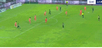 上半场补时第1分钟,孙国文送出倒三角妙传,卡列洛在禁区中路迎球抽射得手帮助浙江队扳平比分。